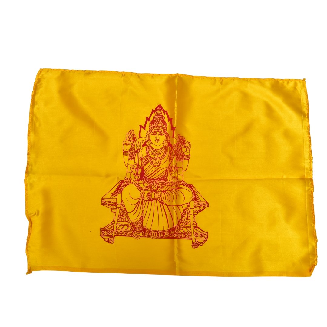 This large satin devotional flag is perfect for prominent displays during religious ceremonies or festive occasions. Its luxurious shine and crisp fabric make it an ideal centerpiece for devotion and celebration.